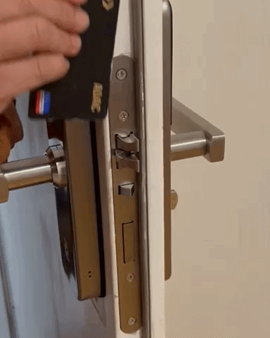 Ein kleiner Vorsprung am Ende der Falle verhakt sich im Schließblech, was das Zurückschieben von außen unmöglich macht.