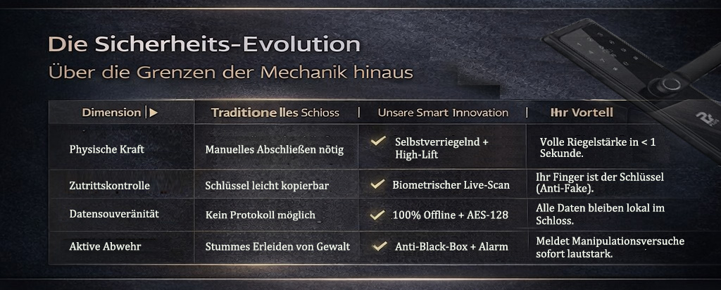 Schneller als Ihr Schlüssel: Biometrischer Sensor öffnet in Echtzeit. Ideal für Senioren & Kinder.